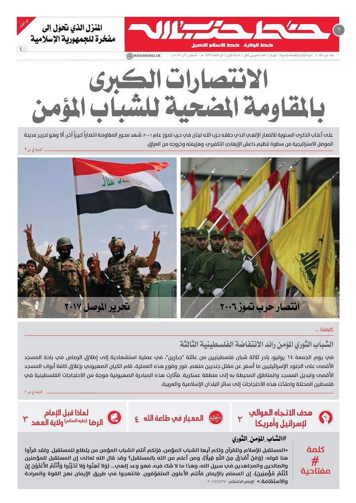 ينشر موقع KHAMENEI.IR الإعلامي العدد التجريبي الثاني من نشرة خط حزب الله. في هذا العدد تمّ تسليط الضوء على انتصارات المقاومة العظيمة منذ حرب تموز التي شنها الصهاينة على لبنان حتى تحرير الموصل من أيادي تنظيم داعش الإرهابي، كما تمّ الحديث حول دور الشباب الفلسطيني الثوري المؤمن في الانتفاضة الفلسطينية وغيرها من المواضيع الاجتماعية، السياسية والدينية.