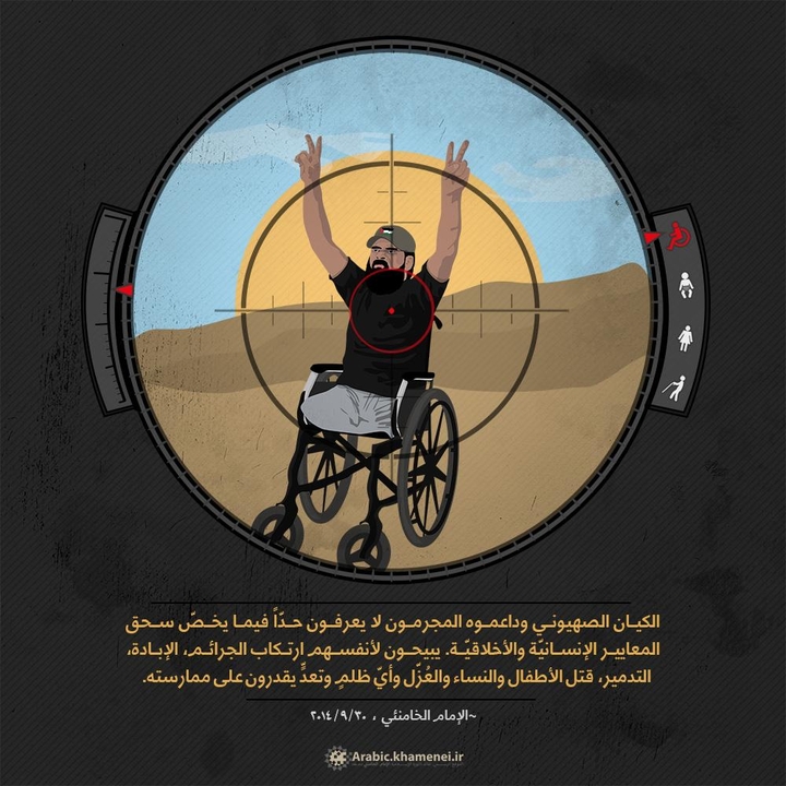 كل من يدعم الصهيونية اليوم، سواء من مسؤولي البلدان المستكبرة مثل أمريكا وبريطانيا وسواهما أو الأوساط العامة مثل منظمة الأمم المتحدة ممن يدعمونهم بشكل من الأشكال، ربما بصمتهم، أو بتصريحاتهم وكلماتهم غير المنصفة، هم أيضاً شركاء في الجريمة. من واجب العالم الإسلامي كله وجميع الحكومات الإسلامية وكل أبناء الشعوب المسملة أن تعارضهم وتواجههم وتعلن البراءة و النفور منهم وتلومهم على مواقفهم هذه. هذا واجب عام. يجب فرض العزلة عليهم، وإذا استطاعوا فليتصدوا لهم اقتصادياً وسياسياً. هذا هو واجب الأمة الإسلامية.