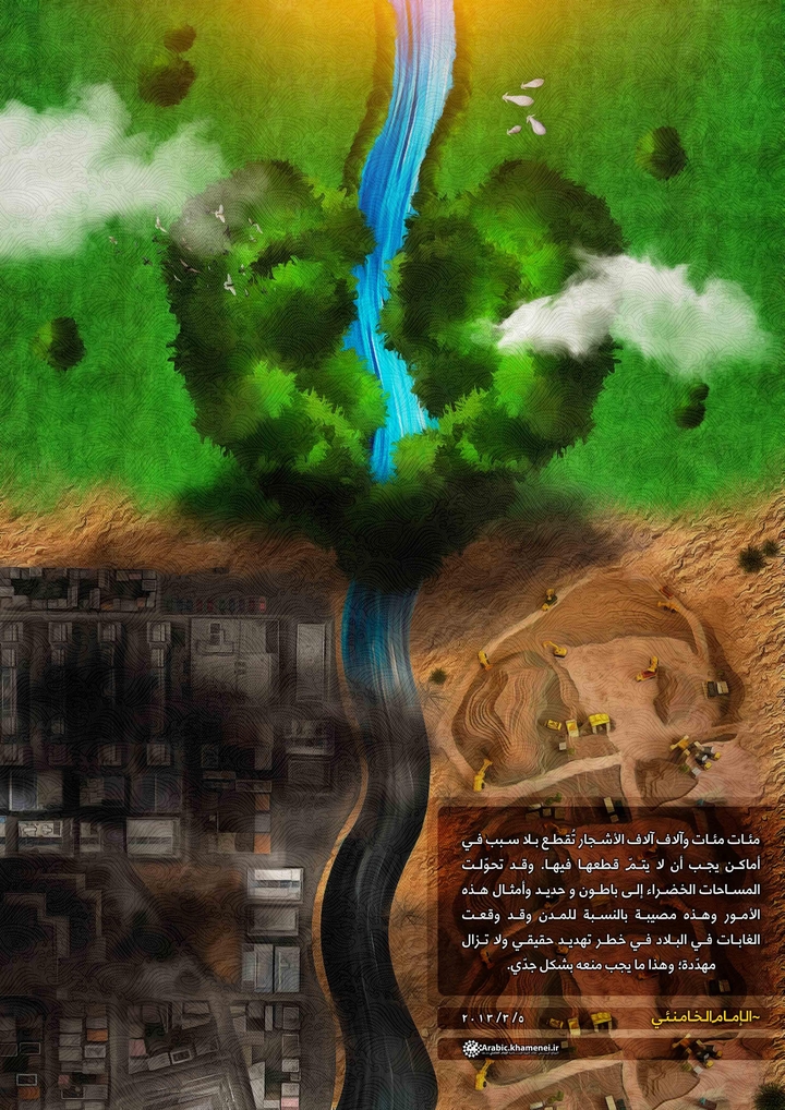 و لکن یجب أن أوجّه عتاباً لمجموعة المسؤولین عن قضیة الأشجار و غرس الأشجار و الغابات و ما شاکل، و هو أننا هنا نغرس الأشجار واحدة واحدة، لکن الأشجار تقطع بالمئات و الآلآف فی الأماکن التی یجب أن لا تقطع. هذا إشکال کبیر قائم. هذا بالإضافة إلی إحالة المعمورات و المساحات الخضراء فی أطراف المدن الکبری خطأ و غصباً لأشخاص أرادوا إساءة استغلال الأرض و لا زالوا یستغلونها، و تبدّلت المساحات الخضراء إلی إسمنت و حدید و ما إلی ذلک - و هذه مصیبة للمدن - و تعرّضت و تتعرّض مجموعة الغابات فی البلاد لتهدیدات و أخطار جادة، فیجب الحیلولة دون ذلک بکل جدّ.