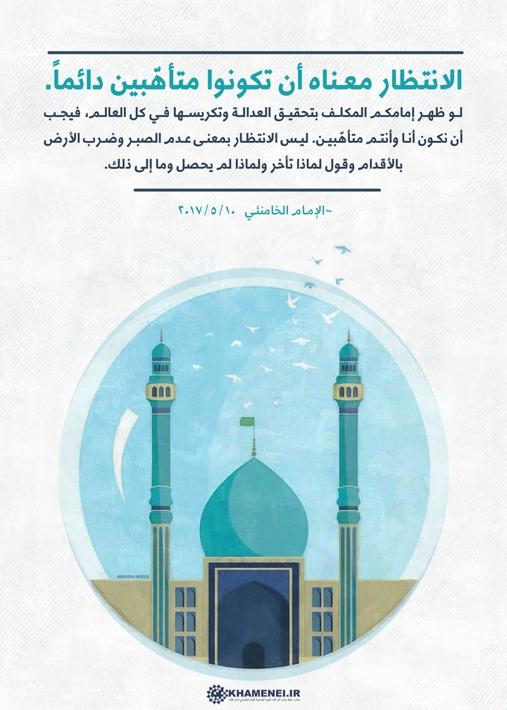ليس معنى الانتظار أن يقعد الإنسان ولا يفعل شيئاً ولا يهتمّ لأيّ عمل إصلاحي، ويغتبط فقط بأنّه ينتظر الإمام المهدي (عج). هذا ليس انتظاراً. ما هو الانتظار؟ إنّه انتظار اليد الإلهيّة الملكوتيّة القاهرة القويّة كي تأتي وتزيل الظّلم بمساعدة الناس أنفسهم وتُغلّب الحق، وتُسوَّد العدل في حياة النّاس وترفع راية التوحيد، وتجعل البشر عباداً حقيقيّين لله. ينبغي الاستعداد لهذه المهمّة. تأسيس نظام الجمهورية الإسلامية إحدى مقدّمات هذه الحركة التاريخيّة العظيمة. أيّة خطوة باتجاه تكريس العدالة هي خطوة باتجاه ذلك الهدف السامي. هذا هو معنى الانتظار. الانتظار حركة وليس سكوناً أو إهمالاً أو قعوداً كي تجري الأمور لوحدها. الانتظار حركة. الانتظار استعداد. علينا الحفاظ على هذا الاستعداد وهذه الجهوزيّة داخل وجودنا وفي بيئتنا المحيطة بنا.
