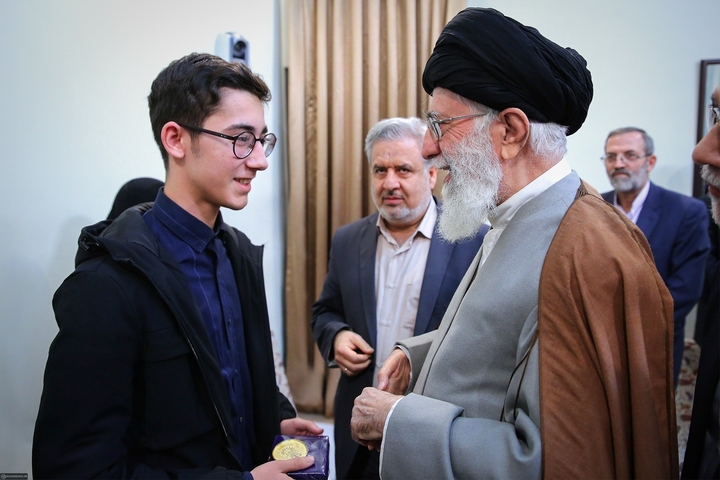 الإمام الخامنئي: الله الله! هذا جميلٌ للغاية. وقد سررن كثيراً يا سيّد غلامي، السيّد آرين العزيز. نحن مسرورون لوجود أمثالكم بيننا بفضل الله. أنتم ذخر لمستقبل البلاد؛ فلتحافظوا على هذه الذخيرة.