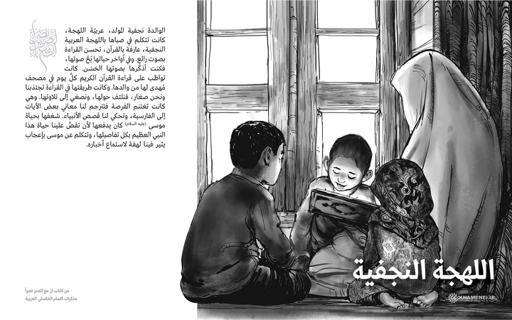 الوالدة نجفیة المولد، عربیّة اللهجة، كانت تتكلم في صباها باللهجة العربیة النجفیة، عارفة بالقرآن، تحسن القراءة بصوت رائع. وفي أواخر حیاتها بُحَّ صوتها، فكنت أذكّرها بصوتها الحَسَن. كانت تواظب علی قراءة القرآن الكریم كلَّ یوم في مصحف مُهدی لها من والدها. وكانت طریقتها في القراءة تجتذبنا ونحن صغار، فنلتف حولها، ونصغي إلی تلاوتها. وهي كانت تغتنم الفرصة فتترجم لنا معاني بعض الآیات إلی الفارسیة، وتحكي لنا قصص الأنبیاء. شغفها بحیاة موسی (عليه السلام) كان یدفعها لأن تقصَّ علینا حیاة هذا النبي العظیم بكل تفاصیلها، وتتكلم عن موسی بإعجاب یثیر فینا لهفة لاستماع أخباره.
