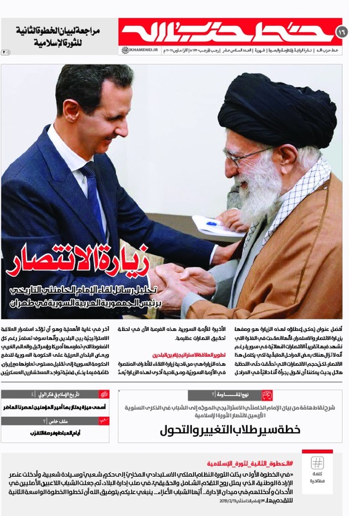 صدر عن موقع KHAMENEI.IR الإعلامي العدد السادس عشر من نشرة خط حزب الله حيث حمل قسم كلمتنا لهذا العدد عنوان "زيارة الانتصار" والذي تضمّن تحليلاً لرسائل اللقاء التاريخي الذي جمع الرئيس السوري بالإمام الخامنئي كما تم التطرّق في هذا العدد ضمن فقرة نهج المقاومة إلى جوانب وأبعاد بيان الخطوة الثانية للثورة الإسلامية الذي وجّهه الإمام الخامنئي للشباب ووردت أيضاً مواضيع عدّة تناولت أهميّة شهري رجب وشعبان وشرح فضائل الإمام علي (عليه السلام).