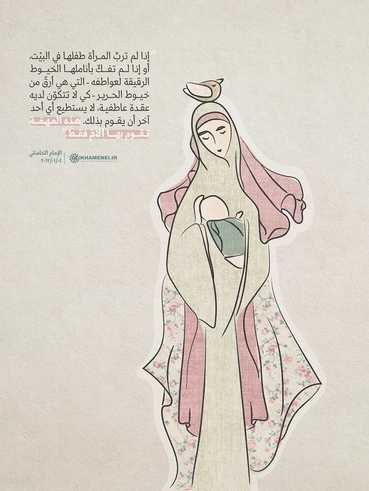 تستطيع الأم أن تُربي أولادها على أفضل نحوٍ. تربية الأم لأولادها ليست كالتربية على مقاعد الدراسة. بل هو بالتصرّف، في الكلام، بالعاطفة، بالملاطفة، بغناء هدهدة ما قبل النوم، بالعيش. الأم تربي أولادها بالحياة والعيش، فكلّما كانت المرأة أصلح، أعقل، أذكى، كلّما كانت التربية أفضل. لذلك ينبغي التخطيط ووضع الخطط في البلاد، من أجل رفع مستوى الإيمان، العلم والذكاء لدى السيدات.