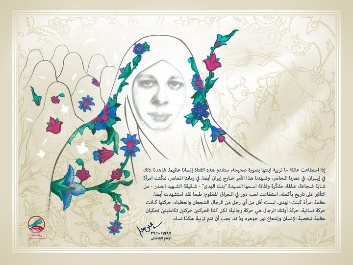 يا أخواتي، ويا بناتي، ويا سيّدات هذا البلد الإسلامي، اعلمن إن أية امرأة متى نشأت على هذه التربية وحيثما كانت وفي أية أسرة كانت، يمكنها بلوغ نفس تلك العظمة التي لا تختص بعصر صدر الإسلام، بل يتيسّر بلوغها حتى في عهود الكبت وفي عهود تسلّط الكفر. وكل أسرة تربّي فتاتها تربية سليمة، تصبح تلك الفتاة امرأة عظيمة. وكانت لدينا في إيران نساء من هذا النمط، وكان لدينا ذلك حتى في العصر الحاضر، في عصرنا هذا استطاعت امرأة شجاعة عالمة مفكّرة بارعة في مقتبل العمر اسمها السيّدة بنت الهدى ــ أخت الشهيد الصدر ــ أن تترك بصماتها على التاريخ، وأن تؤدّي دوراً في العراق المظلوم إلى أن استشهدت. عظمة مثل هذه المرأة لا تقل عن عظمة أي من الرجال الشجعان والعظماء. لقد كان موقفها موقفاً نسوياً وموقف ذلك الرجل [أخوها الشهيد محمد باقر الصدر] موقفاً رجولياً، ولكن كلاهما يَنّمان عن حركة تكاملية ويعبّران عن عظمة وتألّق جوهر هذا الإنسان. وهكذا فلتربّى النساء.