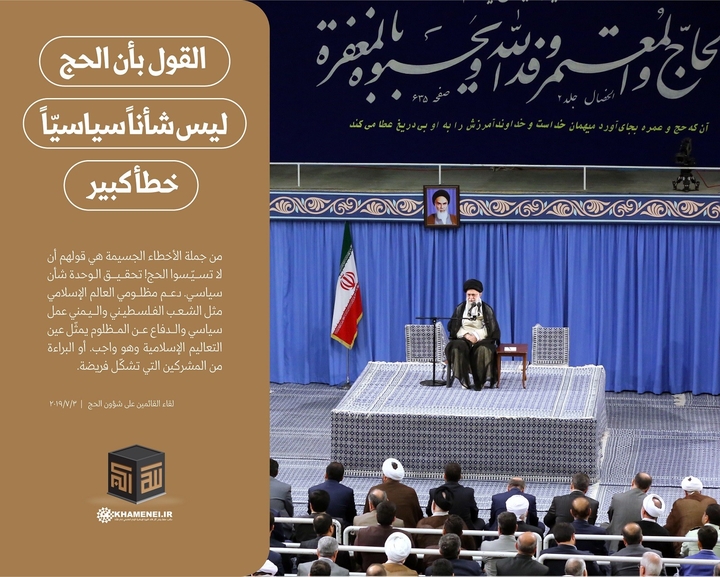 من جملة الأخطاء الجسيمة التي كنا نسمعها دائماً، ولا تزال تصدر الآن أيضاً من بعض الألسنة غير المكترثة لحقائق الإسلام أنه «لا تسيسوا الحج»، ما معنى لا تسيسوا الحج؟ ما نحتاجه في الحج من الشؤون السياسية هو عين تعاليم الإسلام. تحقيق الوحدة شأن سياسي وهو أمر الإسلام وهو عبادة «وَاعتَصِموا بِحَبلِ اللهِ جَميعًا وَلا تَفَرَّقوا». إننا حين ندافع في الحج عن الشعب الفلسطيني أو المظلومين في العالم الإسلامي مثل مظلومي اليمن والآخرين وندعمهم فهذا فعل سياسي لكنها سياسة تمثل عين تعاليم الإسلام. فالدفاع عن المظلوم هو بحد ذاته فريضة وواجب، وهذا الواجب يحدث. أو البراءة من المشركين، إذا كنا نشدد ونصر على قضية البراءة ونقوم بها ـ وينبغي أن تتم كل عام على أفضل وجه إن شاء الله ـ فالسبب هو أنها فريضة إسلامية «أَنَّ اللَّهَ بَريءٌ مِنَ المُشرِكينَ وَرَسولُه». المؤمنون «بُرَآءِ» من المشركين «إِنَّا بُرَآؤُا مِنكم وَ مِمَّا تَعبُدُونَ مِن دُونِ اللَّهِ كفَرنا بِكم وَ بَدا بَينَنا وَ بَينَكمُ الْعَداوَةُ وَ الْبَغضاءُ أَبَداً حتى تُؤمِنُوا بِاللَّهِ وَحدَهُ». كل هذه تعاليم دينية. نعم، إنها سياسة، ثمة في الحج عمل سياسي، بيد أن هذا العمل السياسي هو نفسه وبعينه التكليف الديني، إنه العبادة ذاتها. لاحظوا أن هذه من النقاط المهمة. نعم، أن يمنعوا مثل هذه التحركات السياسية فهذا أيضاً عمل سياسي، لكنها سياسة غير دينية، سياسة مناهضة للدين. أن يقولوا لا يحق لكم في الحج أن تكشفوا حقيقة أمريكا فهذا أيضاً حراك سياسي لكنه حراك سياسي شيطاني، حراك سياسي غير إسلامي. ولكن أن تعلنوا هناك عن براءتكم من أي مشرك ومن أي معاد للإسلام فهذا أيضاً حراك سياسي لكنها سياسة تمثل عين الدين، هذه هي السياسة الدينية. هذه نقاط يجب أن نعلمها في خصوص الحج.