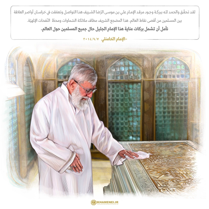 وجود هذا المرقد الشريف في هذا الجزء من الوطن الإسلامي الكبير كان له أيضاً بركات عديدة. فالحمد لله أنّ التواصل بين المسلمين من أقصى نقاط العالم -أولئك الذين تنبض قلوبهم بحبّ أهل البيت، من كافّة الفرق والجماعات الإسلاميّة- قد تحقّق ببركة هذا المزار الطاهر، وهذا المضجع الشريف وحرم أهل البيت هذا في خراسان. كلّنا أملٌ إن شاء الله بأن تتضاعف يومًا بعد يوم بركات وجود هذا المرقد المطهّر الذي هو محطّ توجّه قلوبنا إلى معنويّات هذه العترة الطاهرة المطهّرة. هنا مرقدُ علي بن موسى الرضا سلام الله عليه مطاف ملائكة السماوات، ومحضر النفحات الإلهيّة. والقلوب الطاهرة، القلوب العاشقة، أولئك الذين أودعوا قلوبهم لهذه العترة المطهّرة، هناك يناجون الله تعالى بقلوبهم المشتاقة؛ إنّه مركزُ ذِكر، مركزُ توجّه، مركزُ توحيد، ببركة مرقد الإمام الثامن عليه آلاف التحيّة والسلام. كلّنا أمل بأن تشمل بركات عناية هذا العظيم حالنا جميعًا، كل الشعب الإيراني وجميع مسلمي العالم، وأن توجِبَ ارتباطاً أمتن وأقوى بين المسلمين في الأيام القادمة كما حدث في الماضي.