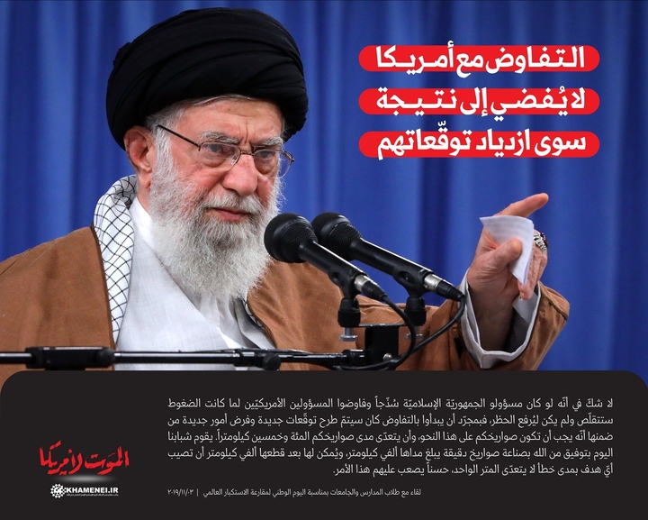 لا شكّ في أنّه لو كان مسؤولو الجمهوريّة الإسلاميّة سُذّجاً وفاوضوا المسؤولين الأمريكيّين لما كانت الضغوط ستتقلّص ولم يكن ليُرفع الحظر، فبمجرّد أن يبدأوا بالتفاوض كان سيتمّ طرح توقّعات جديدة وفرض أمور جديدة من ضمنها أنّه يجب أن تكون صواريخكم على هذا النحو، وأن يتعدّى مدى صواريخكم المئة وخمسين كيلومتراً. يقوم شبابنا اليوم بتوفيق من الله بصناعة صواريخ دقيقة يبلغ مداها ألفي كيلومتر، ويُمكن لها بعد قطعها ألفي كيلومتر أن تصيب أيّ هدف بمدى خطأ لا يتعدّى المتر الواحد، حسناً يصعب عليهم هذا الأمر.