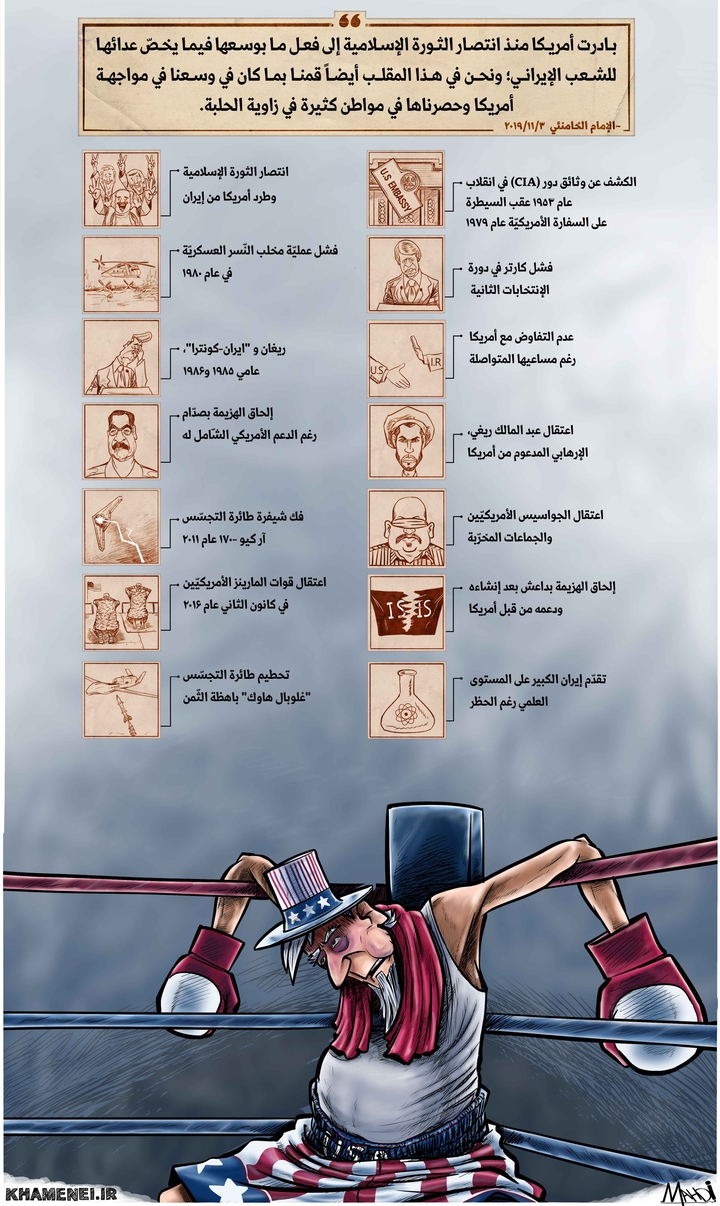 ينشر موقع KHAMENEI.IR الإعلامي انفوغرافاً يُسلّط الضوء على الأحداث التاريخية التي استطاعت فيها الجمهورية الإسلامية في إيران حصر أمريكا في زاوية الحلبة وإلحاق الهزيمة بها.