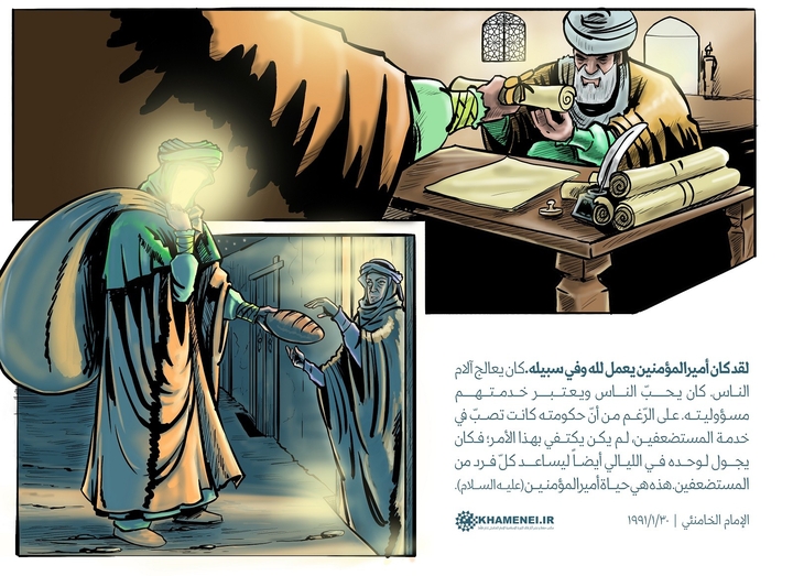 لقد كان أميرالمؤمنين يعمل لله وفي سبيله. كان يعالج آلام الناس. كان يحبّ الناس ويعتبر خدمتهم مسؤوليته. على الرّغم من أنّ حكومته كانت تصبّ في خدمة المستضعفين، لم يكن يكتفي بهذا الأمر؛ فكان يجول لوحده في الليالي أيضاً ليساعد كلّ فرد من المستضعفين. هذه هي حياة أميرالمؤمنين (عليه السلام).