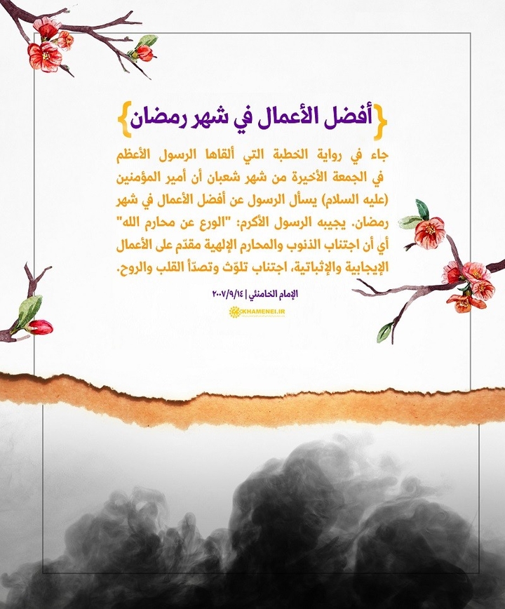 وقبل کل هذا وربما فوق کل هذا ترك المعاصي والذنوب. فهم لا یرتکبون المعاصي في هذا الشهر. في الروایة الواردة حول خطبة الرسول الأعظم (ص) هذه، یسأل الإمام علي بن أبي طالب (علیه الصلاة والسلام) الرسول الأعظم (صلوات الله وسلامه علیه وآله): أيّ الأعمال أفضل في هذا الشهر؟ فیجیب الرسول (ص): «الورع عن محارم الله». اجتناب الذنوب وما حرّمه الله مقدّم علی الأعمال الإیجابیة. ترك المعاصي يحول دون تلوّث الروح والقلب. وهؤلاء الذین نتحدث عنهم یتجنّبون المعاصي أیضاً. إذن، فهناك الصیام، وهناك تلاوة القرآن، وهناك الدعاء وذکر الله، وهناك البُعد عن المعاصي. هذه المنظومة تقرّب الإنسان من حیث الأخلاق والسلوك من الحالة التي یریدها الإسلام. حین تحصل هذه المجموعة من الأعمال یخلو قلب الإنسان من الأحقاد، وتُبعث فیه روحُ التضحیة والإیثار، وتصبح مساعدة المحرومین والفقراء سهلة علیه، ویسهل علیه أیضاً الصفح والتجاوز لصالح الآخرین وبما یضرّه فی الأمور المادیة. لذلك تلاحظون أن الجرائم تقل في شهر رمضان، وتکثر فیه الخیرات، وتزداد فیه المحبّة بین الناس. وهذه کلها ببرکة هذه الضیافة الإلهیة.