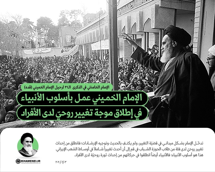 تدخّل الإمام بشكل ميداني في قضيّة التغيير، ولم يكتفِ بالحديث وتوجيه الإرشادات؛ فانطلق من إحداث تغيير روحيّ لدى فئة من طلاب الحوزة الشباب في قم إلى أن أحدث تغييراً شاملاً في أوساط الشعب الإيراني. هذا هو أسلوب الأنبياء؛ فالأنبياء أيضاً انطلقوا في حركاتهم من إحداث ثورة روحيّة لدى الأفراد.