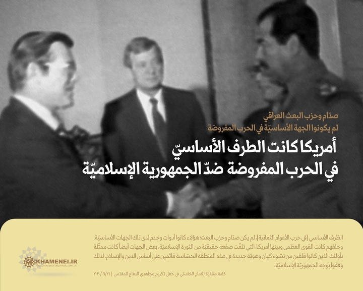 الطّرف الأساسي [في حرب الأعوام الثمانية]، لم يكن صدّام وحزب البعث؛ هؤلاء كانوا أدوات وخدم لدى تلك الجهات الأساسيّة. وخلفهم كانت القوى العظمى وبينها أمريكا، التي تلقّت صفعة حقيقيّة من الثورة الإسلاميّة. بعض الجهات أيضاً كانت ممثّلة بأولئك الذين كانوا قلقين من نشوء كيان وهويّة جديدة في هذه المنطقة الحسّاسة قائمين على أساس الدين والإسلام. لذلك وقفوا بوجه الجمهوريّة الإسلاميّة.