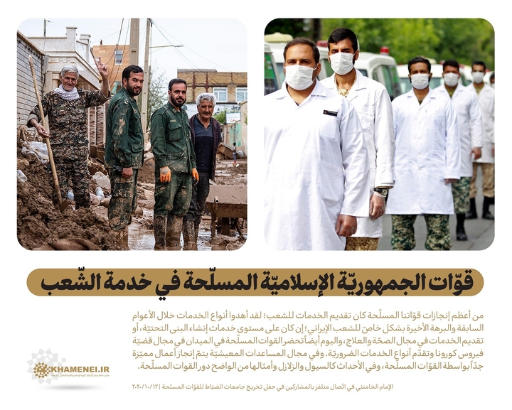 من أعظم إنجازات قوّاتنا المسلّحة كان تقديم الخدمات للشعب؛ لقد أهدوا أنواع الخدمات خلال الأعوام السابقة والبرهة الأخيرة بشكل خاصّ للشعب الإيراني؛ إن كان على مستوى خدمات إنشاء البنى التحتيّة، أو تقديم الخدمات في مجال الصحّة والعلاج، واليوم أيضاً تحضر القوات المسلّحة في الميدان في مجال قضيّة فيروس كورونا وتقدّم أنواع الخدمات الضروريّة. وفي مجال المساعدات المعيشيّة يتمّ إنجاز أعمال مميّزة جدّاً بواسطة القوّات المسلّحة، وفي الأحداث كالسيول والزلازل وأمثالها من الواضح دور القوات المسلّحة.