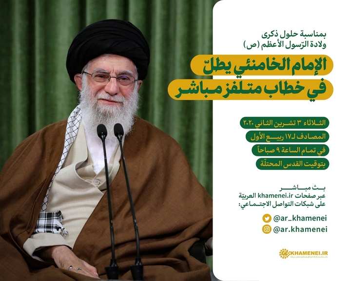 يلقي الإمام الخامنئي يوم الثلاثاء 3 تشرين الثاني 2020 المصادف للسابع عشر من شهر ربيع الأول كلمة متلفزة سوف تُبثّ على الهواء مباشرة في تمام الساعة 9 صباحاً بتوقيت القدس المحتلّة.