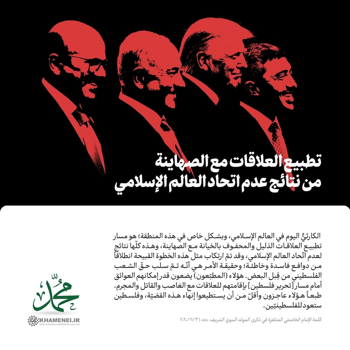 الكارثيٌّ اليوم في العالم الإسلامي، وبشكل خاص في هذه المنطقة؛ هو مسار تطبيع العلاقات الذليل والمحفوف بالخيانة مع الصهاينة، وهذه كلّها نتائج لعدم اتّحاد العالم الإسلامي، وقد تمّ ارتكاب مثل هذه الخطوة القبيحة انطلاقاً من دوافع فاسدة وخاطئة؛ وحقيقة الأمر هي أنّه تمّ سلب حقّ الشعب الفلسطيني من قِبل البعض. هؤلاء (المطبّعون) يضعون قدر إمكانهم العوائق أمام مسار [تحرير فلسطين] بإقامتهم للعلاقات مع الغاصب والقاتل والمجرم. طبعاً هؤلاء عاجزون وأقلّ من أن يستطيعوا إنهاء هذه القضيّة، وفلسطين ستعود للفلسطينيّين.