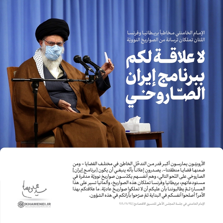 الأروبيّون يمارسون أكبر قدر من التدخّل الخاطئ في مختلف القضايا - ومن ضمنها قضايا منطقتنا-. يصدرون إعلاناً بأنّه ينبغي أن يكون [برنامج إيران] الصاروخي على النّحو التالي، وهم أنفسهم يكدّسون صواريخ نوويّة مدمّرة في مستودعاتهم، بريطانيا وفرنسا تملكان هذه الصواريخ، وألمانيا تسير على هذا المسار؛ ثمّ يطالبوننا بأن عليكم أن لا تملكوا صواريخ عاديّة. ما علاقتكم بهذا الأمر؟ أصلحوا أنفسكم في البداية ثمّ صرّحوا بآرائكم في هذه الشؤون.