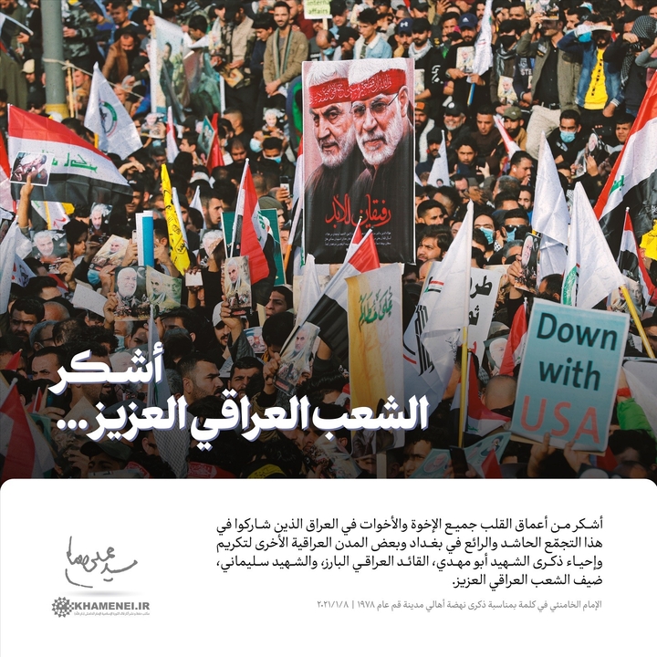 أشكر من أعماق القلب جميع الإخوة والأخوات في العراق الذين شاركوا في هذا التجمّع الحاشد والرائع في بغداد وبعض المدن العراقية الأخرى لتكريم وإحياء ذكرى الشهيد أبو مهدي، القائد العراقي البارز، والشهيد سليماني، ضيف الشعب العراقي العزيز.