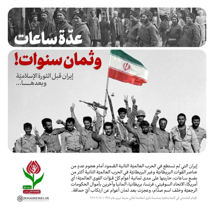 إيران التي لم تستطع في الحرب العالميّة الثانية الصّمود أمام هجوم عددٍ من عناصر القوات البريطانيّة وغير البريطانيّة أكثر من بضع ساعات، حاربتها على مدى ثمانية أعوام كلّ قوّات القوى العالميّة؛ أي أمريكا، الاتحاد السوفيتي، فرنسا، بريطانيا، ألمانيا وآخرين بأموال الحكومات الرجعيّة وخلف اسم صدّام، وعجزت بعد ثمان أعوام عن ارتكاب أيّ حماقة.