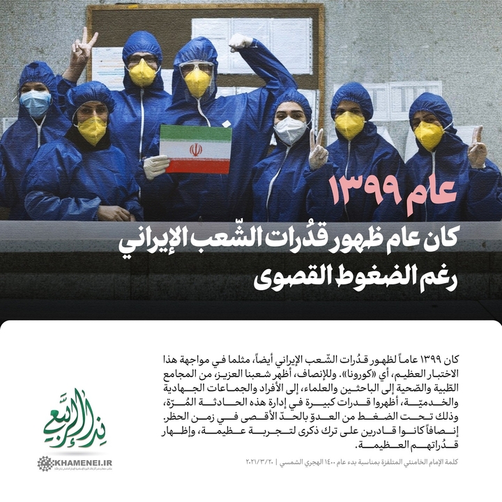 كان 1399 عاماً لظهور قدُرات الشّعب الإيراني أيضاً، مثلما في مواجهة هذا الاختبار العظيم، أي «كورونا». وللإنصاف، أظهر شعبنا العزيز، من المجامع الطّبية والصّحية إلى الباحثين والعلماء، إلى الأفراد والجماعات الجهادية والخدميّة، أظهروا قدرات كبيرة في إدارة هذه الحادثة المُرّة، وذلك تحت الضغط من العدوّ بالحدّ الأقصى في زمن الحظر. إنصافاً كانوا قادرين على ترك ذكرى لتجربة عظيمة، وإظهار قدُراتهم العظيمة.