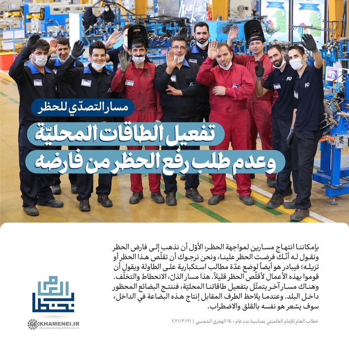 بإمكاننا انتهاج مسارين لمواجهة الحظر: الأوّل أن نذهب إلى فارض الحظر ونقول له أنّك فرضت الحظر علينا، ونحن نرجوك أن تقلّص هذا الحظر أو تزيله؛ فيبادر هو أيضاً لوضع عدّة مطالب استكبارية على الطاولة ويقول أن قوموا بهذه الأعمال لأقلّص الحظر قليلاً. هذا مسار الذلّ، الانحطاط والتخلّف. وهناك مسار آخر يتمثّل بتفعيل طاقاتنا المحليّة، فننتج البضائع المحظور داخل البلد. وعندما يلاحظ الطرف المقابل إنتاج هذه البضاعة في الداخل، سوف يشعر هو نفسه بالقلق والاضطراب.