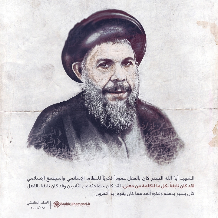 ... بعد انتصار الثورة الإسلامية، عندما وصلنا نبأ استشهاد آية الله الصدر، كانت ضربة قاسية جداً. لقد كان حقاً عموداً فكرياً للنظام الإسلامي والمجتمع الإسلامي. قبل الثورة الإسلامية، كنا مطّلعين على كتبه وأنشطته القيّمة للغاية. وبعد انتصار الثورة، أصدر بيانات جيدة للغاية. كان السيد الصدر محطّ أمل كبير للغاية. لعنة الله على صدام (حسين). الحمد لله اقتُلعت جذور هؤلاء [البعثيين].