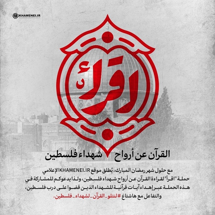 مع حلول شهر رمضان المبارك، يُطلق موقع KHAMENEI.IR الإعلامي حملة "اقرأ" لقراءة القرآن عن أرواح شهداء فلسطين، ولذا يدعوكم للمشاركة في هذه الحملة عبر إهداء آيات قرآنية للشهداء الذين قضوا على درب فلسطين، والتفاعل مع هاشتاغ #لنتلو_القرآن_لشهداء_فلسطين.