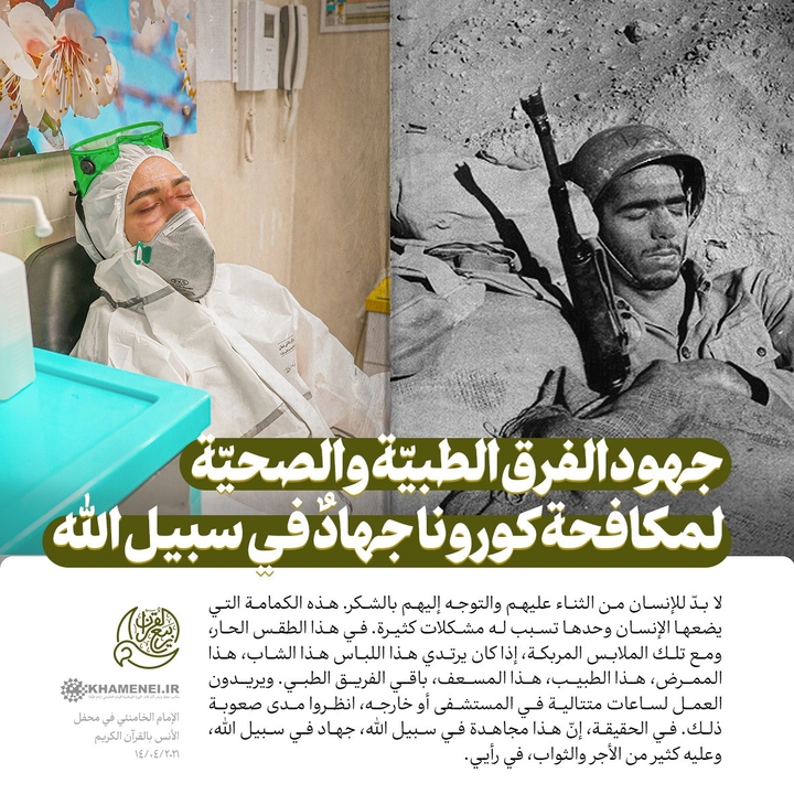 لا بدّ للإنسان من الثناء عليهم والتوجه إليهم بالشكر. هذه الكمامة التي يضعها الإنسان وحدها تسبب له مشكلات كثيرة. في هذا الطقس الحار، ومع تلك الملابس المربكة، إذا كان يرتدي هذا اللباس هذا الشاب، هذا الممرض، هذا الطبيب، هذا المسعف، باقي الفريق الطبي. ويريدون العمل لساعات متتالية في المستشفى أو خارجه، انظروا مدى صعوبة ذلك. في الحقيقة، إنّ هذا مجاهدة في سبيل الله، جهاد في سبيل الله، وعليه كثير من الأجر والثواب، في رأيي.