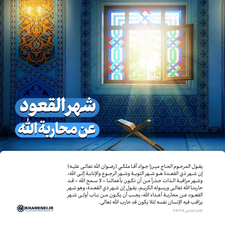 إنه شهر ذي القعدة. يقول المرحوم الحاج ميرزا جواد آقا ملكي (رضوان الله تعالى عليه) إن شهر ذي القعدة هو شهر التوبة وشهر الرجوع والإنابة إلى الله، وشهر مراقبة الذات حذراً من أن نكون بأعمالنا - لا سمح الله - قد حاربنا الله تعالى ورسوله الكريم. يقول إن شهر ذي القعدة، وهو شهر القعود عن محاربة أعداء الله، يجب أن يكون من باب أولى شهر يراقب فيه الإنسان نفسه لئلا يكون قد حارب الله تعالى. ويذكر العمل المعروف في يوم الأحد من ذي القعدة، ويؤكد ويصر على أداء هذا العمل.