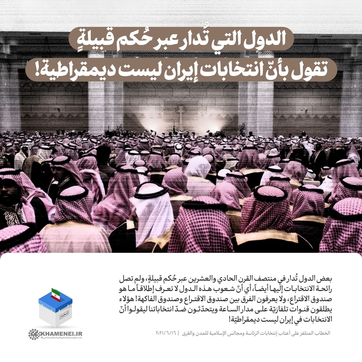 بعض الدول تُدار في منتصف القرن الحادي والعشرين عبر حُكم قبيلةٍ، ولم تصل رائحة الانتخابات إليها أيضاً، أي أنّ شعوب هذه الدول لا تعرف إطلاقاً ما هو صندوق الاقتراع، ولا يعرفون الفرق بين صندوق الاقتراع وصندوق الفاكهة! هؤلاء يطلقون قنوات تلفازيّة على مدار الساعة ويتحدّثون ضدّ انتخاباتنا ليقولوا أنّ الانتخابات في إيران ليست ديمقراطيّة!