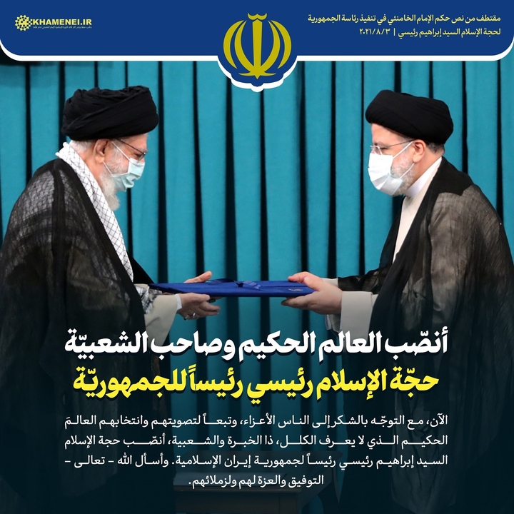 الآن، مع التوجّه بالشكر إلى الناس الأعزاء، وتبعاً لتصويتهم وانتخابهم العالمَ الحكيم الذي لا يعرف الكلل، ذا الخبرة والشعبية، أنصّب حجة الإسلام السيد إبراهيم رئيسي رئيساً لجمهورية إيران الإسلامية. وأسأل الله - تعالى - التوفيق والعزة له ولزملائه.