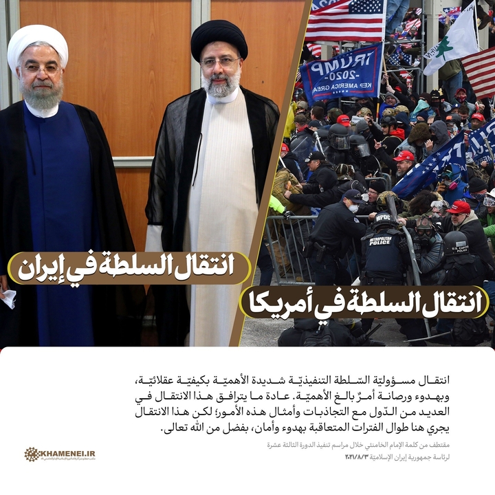 انتقال مسؤوليّة السّلطة التنفيذيّة شديدة الأهميّة بكيفيّة عقلائيّة، وبهدوء ورصانة أمرٌ بالغ الأهميّة. عادة ما يترافق هذا الانتقال في العديد من الدّول مع التجاذبات وأمثال هذه الأمور؛ لكن هذا الانتقال يجري هنا طوال الفترات المتعاقبة بهدوء وأمان، بفضل من الله تعالى.