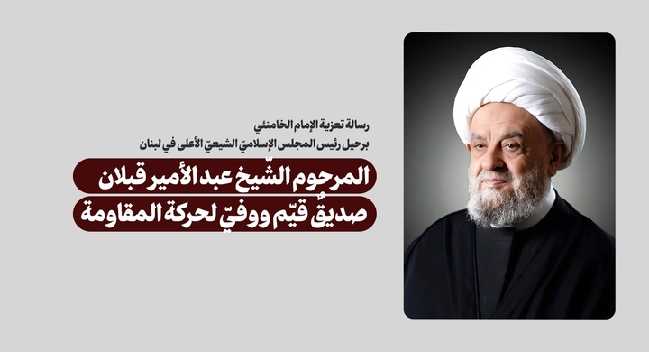 إنّني أتقدّم بأسمى آيات العزاء برحيل العالم المجاهد المرحوم حجّة الإسلام والمسلمين سماحة الشّيخ عبد الأمير قبلان، رحمة الله عليه، من عائلته الفاضلة، والمجلس الأعلى القيّم، وجميع المحبّين والأصدقاء لذاك المرحوم، وعامّة الشيعة في لبنان. لقد كان سماحته صديقاً قيّماً ووفيّاً لحركة المقاومة ولشخص سماحتكم، وأمضى عمره المبارك في خدمة الأهداف السامية في لبنان. إنّ رحيل سماحته يدعو للأسف. أسأل الله - جلّ وعلا - الرّحمة والمغفرة له.