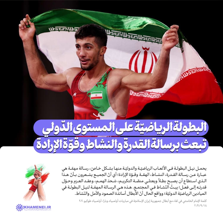 يحمل نيل البطولة في الألعاب الرياضيّة والدوليّة منها بشكل خاصّ، رسالة مهمّة هي عبارة عن رسالة القدرة، النشاط، الهمّة وقوّة الإرادة؛ أي أنّ الجميع يشعرون بأنّ هذا الذي استطاع أن يصبح بطلاً ويعتلي منصّة التكريم، شحذ الهمم، وعقد العزم وحوّل قدرته إلى فعل؛ يبثّ النّشاط في المجتمع. هذه هي الرسالة المهمّة لنيل البطولة في الميادين الرياضيّة الدوليّة؛ وواقع الحال أنّ الأبطال أساتذة الصمود والأمل والنّشاط.