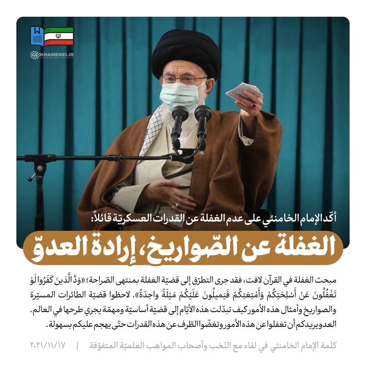 مبحث الغفلة في القرآن لافت، فقد جرى التطرّق إلى قضيّة الغفلة بمنتهى الصّراحة؛ «وَدَّ الَّذينَ كَفَرُوا لَوْ تَغْفُلُونَ عَنْ أَسْلِحَتِكُمْ وَأَمْتِعَتِكُمْ فَيَميلُونَ عَلَيْكُمْ مَيْلَةً واحِدَةً». لاحظوا قضيّة الطائرات المسيّرة والصواريخ وأمثال هذه الأمور كيف تبدّلت هذه الأيّام إلى قضيّة أساسيّة ومهمّة يجري طرحها في العالم. العدو يريدكم أن تغفلوا عن هذه الأمور وتغضّوا الطّرف عن هذه القدرات حتّى يهجم عليكم بسهولة.