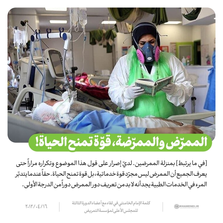 [في ما يرتبط] بمنزلة الممرضين. لديّ إصرار على قول هذا الموضوع وتكراره مراراً حتى يعرف الجميع أن الممرض ليس مجرّد قوة خدماتية، بل قوة تمنح الحياة. حقاً عندما يتدبّر المرء في الخدمات الطبية يجد أنه لا بد من تعريف دور الممرض دوراً من الدرجة الأولى.