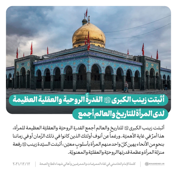 أثبتت زينب الكُبرى (سلام الله عليها) نقطتين: أحدهما أنّ المرأة قادرة على أن تكون محيطاً عظيماً من الصّبر والتحمّل؛ وثانياً أنّها قادرة على أن تكون قمّة عالية من الحكمة والتدبير. هذا ما أثبتته زينب الكبرى على أرض الواقع، ليس فقط لأولئك الذين كانوا في الكوفة والشّام، بل للتاريخ والبشريّة جمعاء.