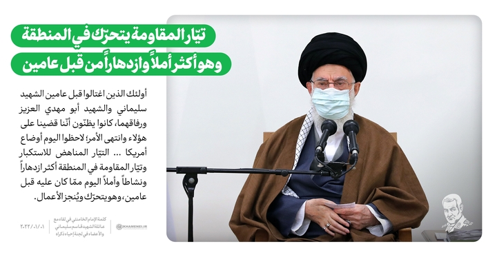 أولئك الذين اغتالوا قبل عامين الشهيد سليماني والشهيد أبو مهدي العزيز ورفاقهما، كانوا يظنّون أنّنا قضينا على هؤلاء وانتهى الأمر؛ لاحظوا اليوم أوضاع أمريكا ... التيّار المناهض للاستكبار وتيّار المقاومة في المنطقة أكثر ازدهاراً ونشاطاً وأملاً اليوم ممّا كان عليه قبل عامين، وهو يتحرّك ويُنجز الأعمال.