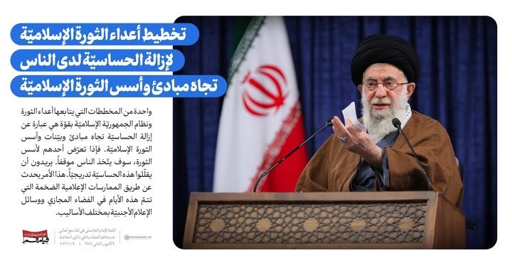 واحدة من المخططات التي يتابعها أعداء الثورة ونظام الجمهوريّة الإسلاميّة بقوّة هي عبارة عن إزالة الحساسيّة تجاه مبادئ وبيّنات وأسس الثورة الإسلاميّة. فإذا تعرّض أحدهم لأسس الثورة، سوف يتّخذ الناس موقفاً. يريدون أن يقلّلوا هذه الحساسيّة تدريجيّاً. هذا الأمر يحدث عن طريق الممارسات الإعلامية الضخمة التي تتمّ هذه الأيام في الفضاء المجازي ووسائل الإعلام الأجنبيّة بمختلف الأساليب.