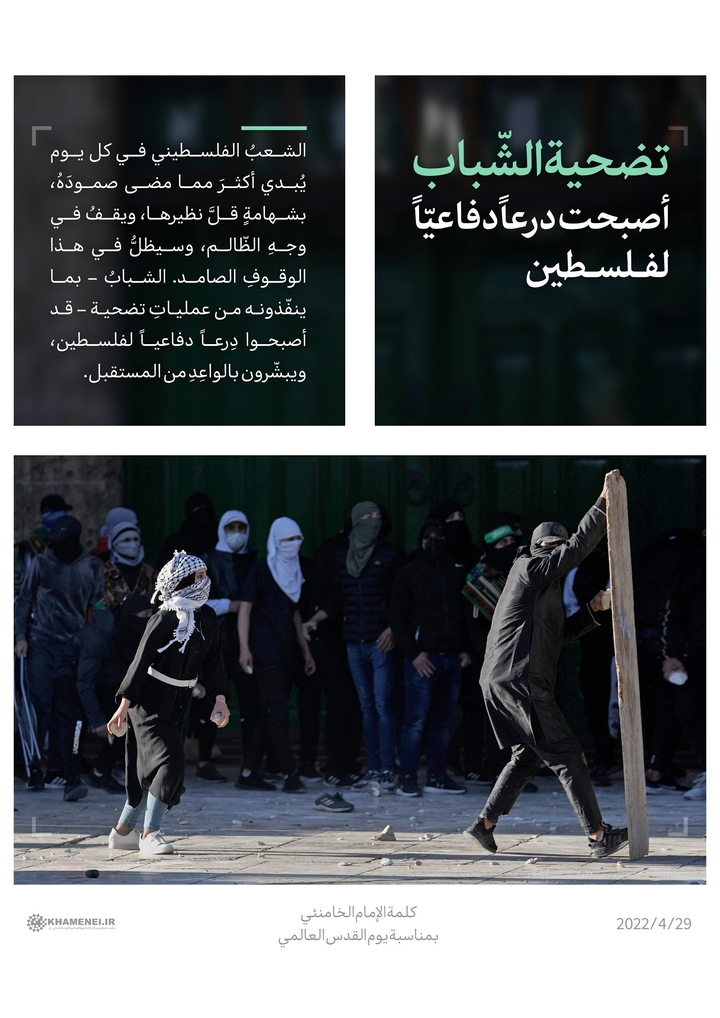 الشعبُ الفلسطيني في كل يوم يُبدي أكثرَ مما مضى صمودَهُ، بشهامةٍ قلَّ نظيرها، ويقفُ في وجهِ الظّالم، وسيظلُّ في هذا الوقوفِ الصامد. الشبابُ – بما ينفّذونه من عملياتِ تضحية – قد أصبحوا دِرعاً دفاعياً لفلسطين، ويبشّرون بالواعِدِ من المستقبل.