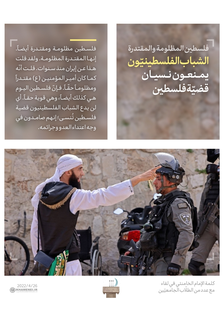 فلسطين مظلومة ومقتدرة أيضاً. إنها المقتدرة المظلومة. ولقد قلت هذا عن إيران منذ سنوات. قلت أنّه كما كان أمير المؤمنين (ع) مقتدراً ومظلوماً حقّاً. فإنّ فلسطين اليوم هي كذلك أيضاً، وهي قوية حقاً. أي لن يدع الشباب الفلسطينيون قضية فلسطين تُنسى؛ إنهم صامدون في وجه اعتداء العدو وجرائمه.