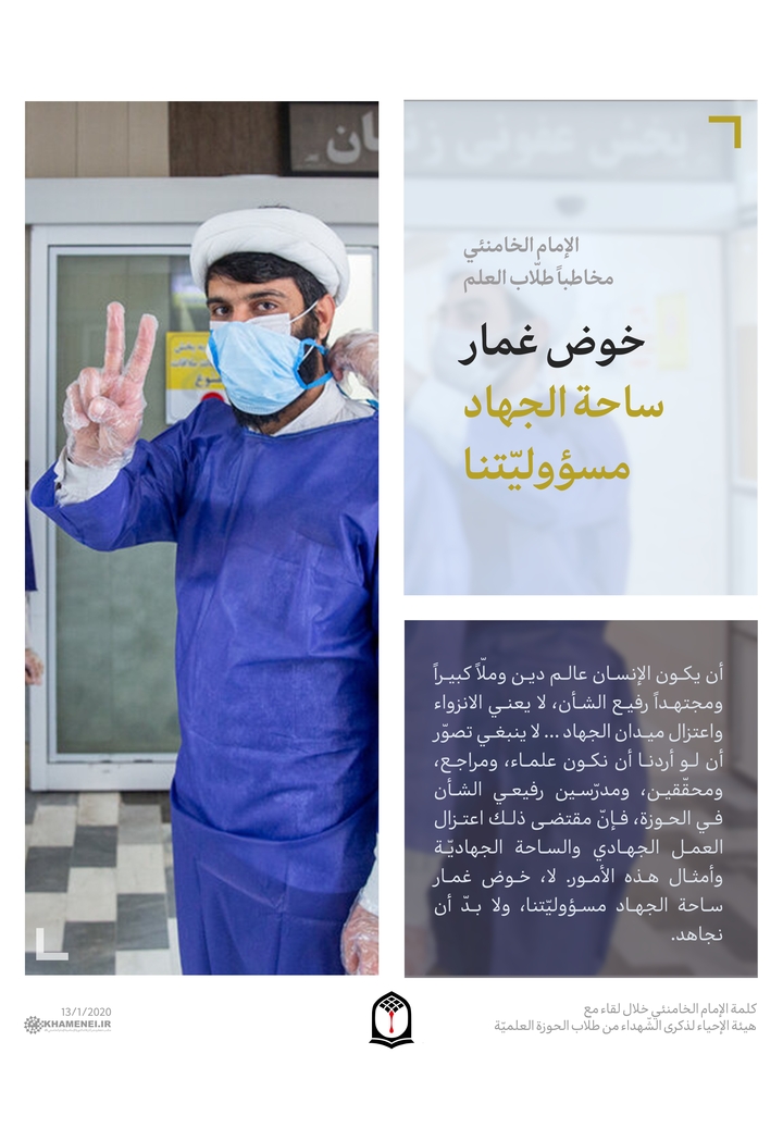 مسؤوليّتنا الأولى والأساسيّة نحن مجتمع علماء الدين هي عبارة عن الدّعوة إلى الخير، العمل الذي كان ينهض به الأنبياء، وأفضل سُبل الدّعوة إلى الخير العمل. العمل في ميدان الخير وميدان الدّعوة. لذلك فإنّ خوض غمار ميدان الجهاد مسؤوليّة أوليّة وبديهيّة وحتميّة لعالم الدّين وطالب العلم.