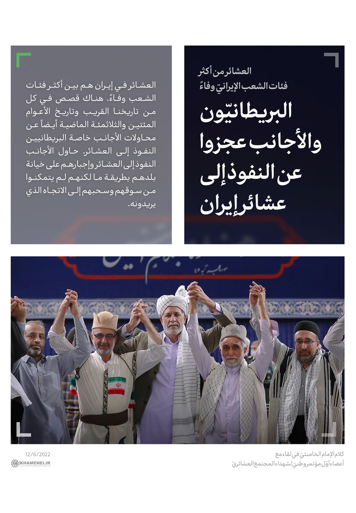 العشائر في إيران هم بين أكثر فئات الشعب وفاءً. هناك قصص في كل من تاريخنا القريب وتاريخ الأعوام المئتين والثلاثمئة الماضية أيضاً عن محاولات الأجانب خاصة البريطانيين النفوذ إلى العشائر. حاول الأجانب النفوذ إلى العشائر وإجبارهم على خيانة بلدهم بطريقة ما لكنهم لم يتمكنوا من سوقهم وسحبهم إلى الاتجاه الذي يريدونه.