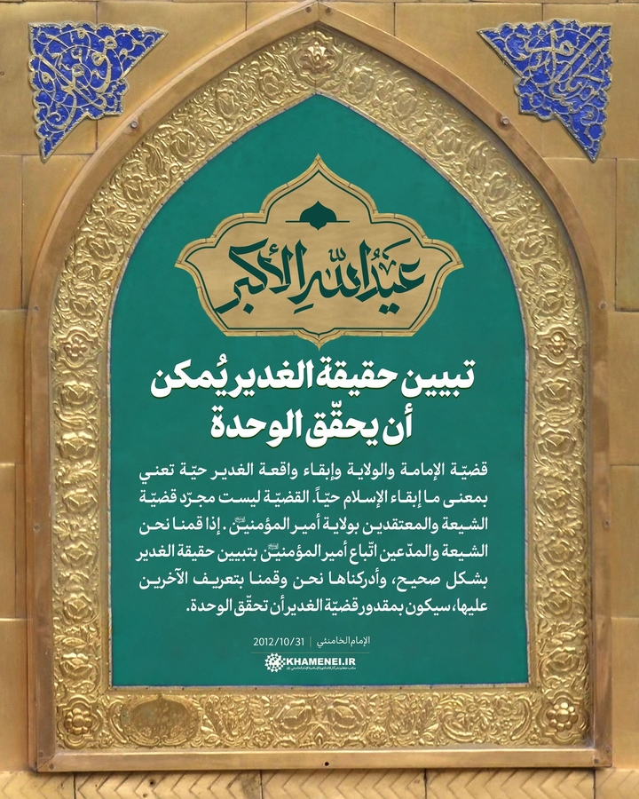 قضيّة الإمامة والولاية وإبقاء واقعة الغدير حيّة تعني بمعنى ما إبقاء الإسلام حيّاً. القضيّة ليست مجرّد قضيّة الشيعة والمعتقدين بولاية أمير المؤمنين (ع). إذا قمنا نحن الشيعة والمدّعين اتّباع أمير المؤمنين (ع) بتبيين حقيقة الغدير بشكل صحيح، وأدركناها نحن وقمنا بتعريف الآخرين عليها، سيكون بمقدور قضيّة الغدير أن تحقّق الوحدة.