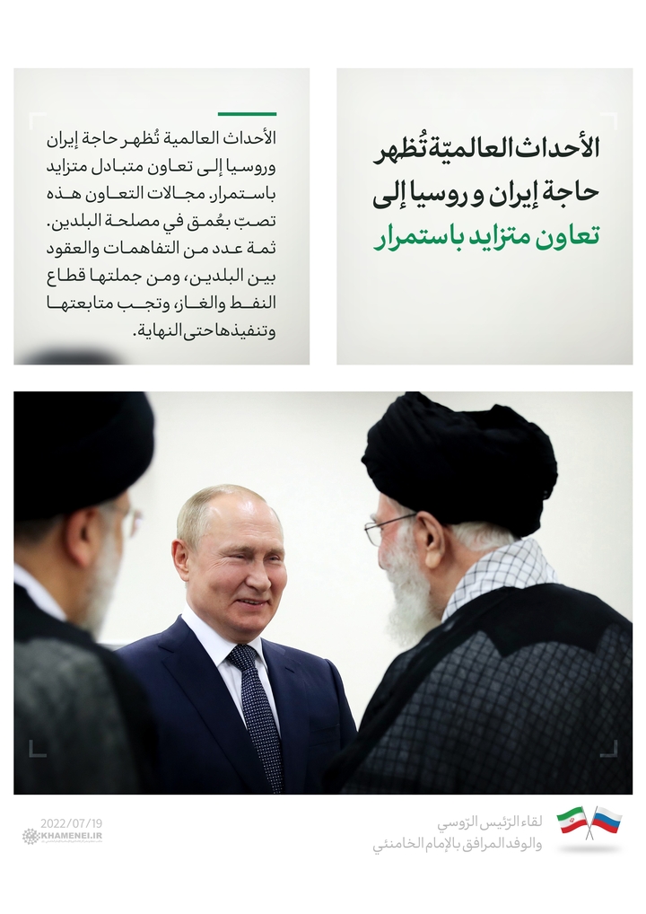 الأحداث العالمية تُظهر حاجة إيران وروسيا إلى تعاون متبادل متزايد باستمرار. مجالات التعاون هذه تصبّ بعُمق في مصلحة البلدين. ثمة عدد من التفاهمات والعقود بين البلدين، ومن جملتها قطاع النفط والغاز، وتجب متابعتها وتنفيذها حتى النهاية.