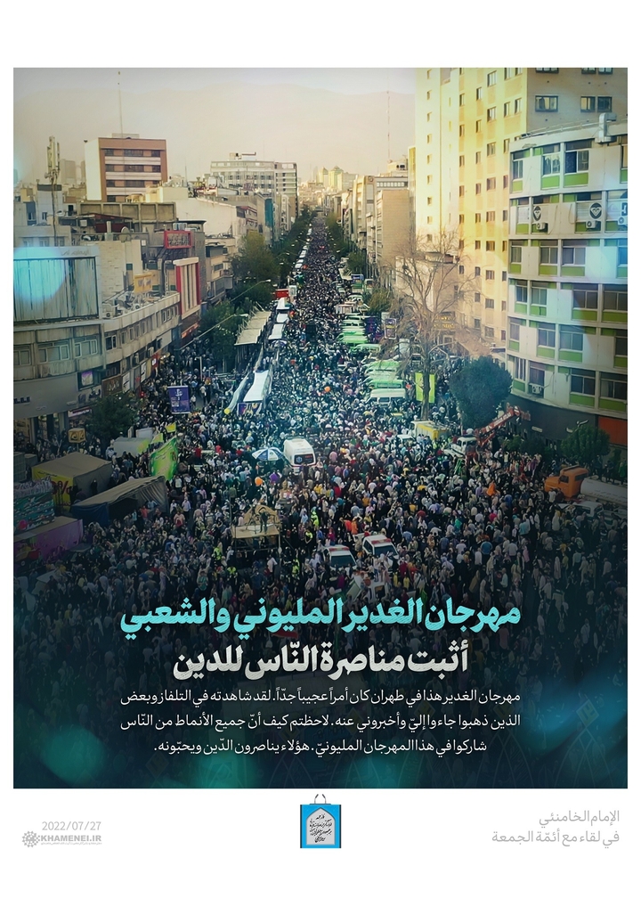 مهرجان الغدير هذا في طهران كان أمراً عجيباً جدّاً. لقد شاهدته في التلفاز وبعض الذين ذهبوا جاءوا إليّ وأخبروني عنه. لاحظتم كيف أنّ جميع الأنماط من النّاس شاركوا في هذا المهرجان المليونيّ. هؤلاء يناصرون الدّين ويحبّونه.