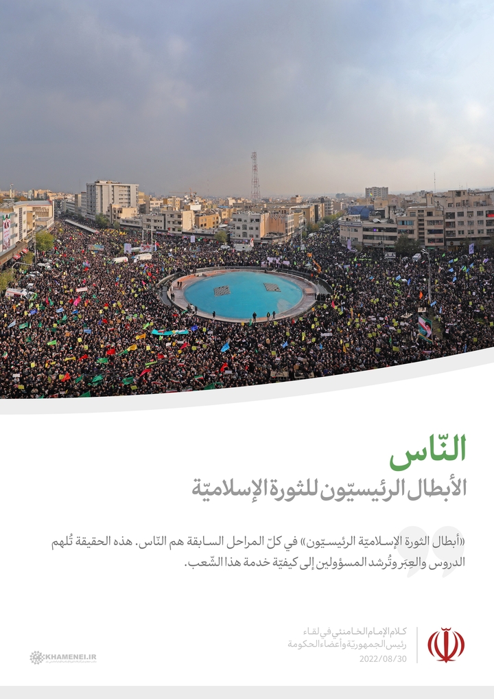 «أبطال الثورة الإسلاميّة الرئيسيّون» في كلّ المراحل السابقة هم النّاس. هذه الحقيقة تُلهم الدروس والعِبَر وتُرشد المسؤولين إلى كيفيّة خدمة هذا الشّعب.