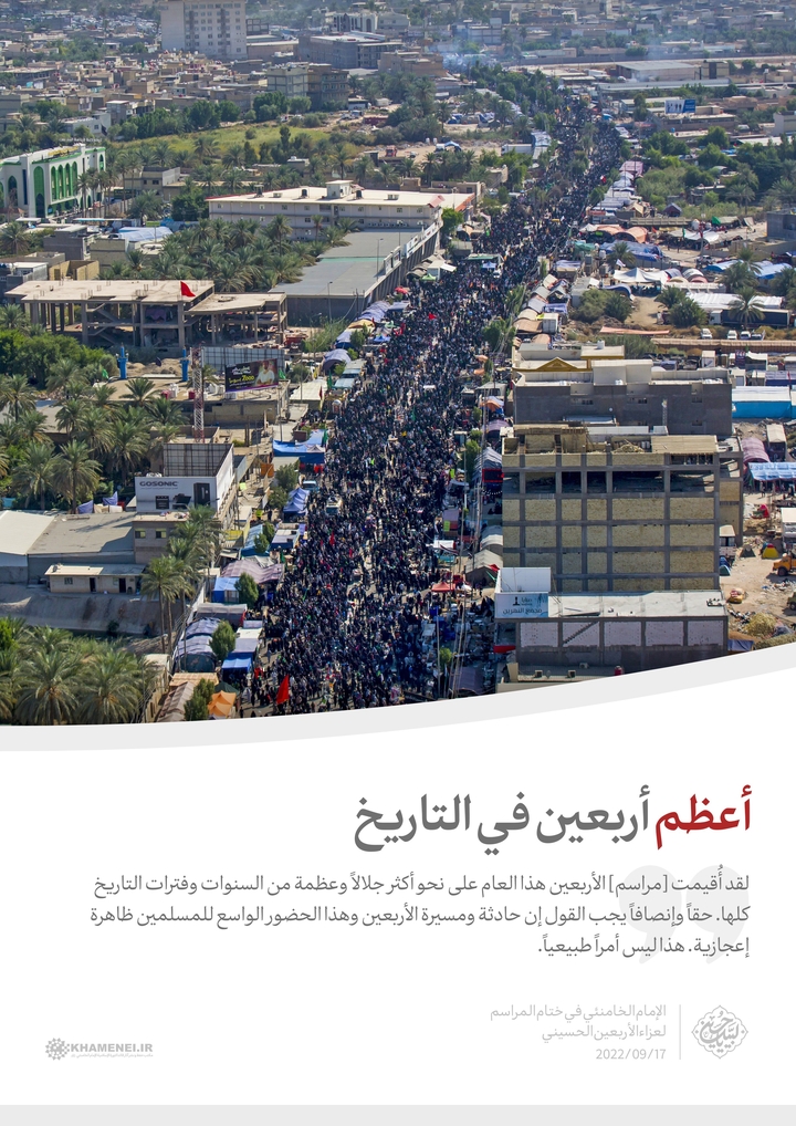 لقد أُقيمت [مراسم] الأربعين هذا العام على نحو أكثر جلالاً وعظمة من السنوات وفترات التاريخ كلها. حقاً وإنصافاً يجب القول إن حادثة ومسيرة الأربعين وهذا الحضور الواسع للمسلمين ظاهرة إعجازية. هذا ليس أمراً طبيعياً.