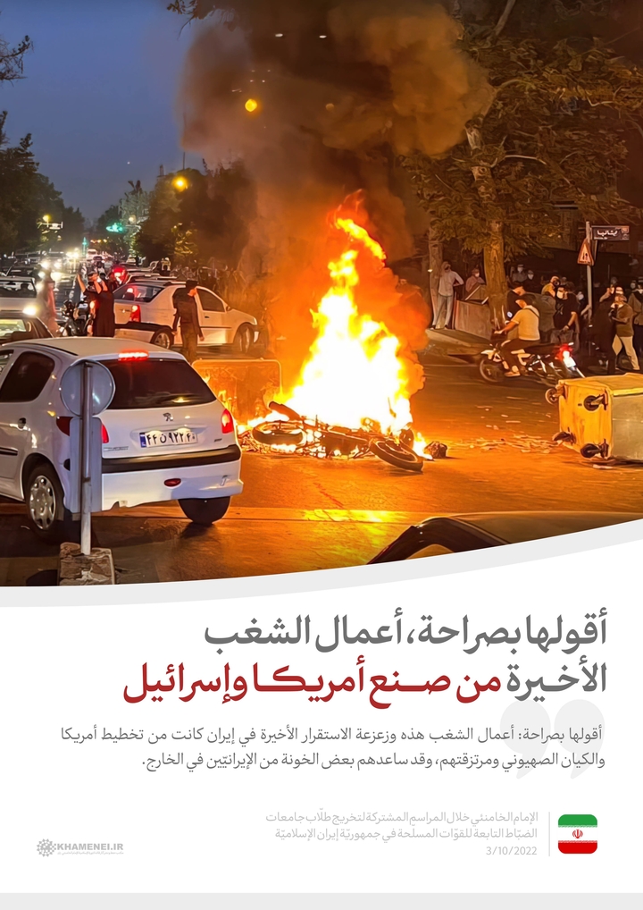 النزاع ليس حول قضيّة الحجاب والحجاب الرديء، ولا حول وفاة شابّة. المسألة ليست هذه الأمور. كثيرات من هؤلاء النساء اللواتي لا يرتدين حتى حجاباً كاملاً هنّ من الأنصار الحقيقيين لنظام الجمهوريّة الإسلاميّة. أنتم ترون أنّهن يشاركن في المراسم الدينية والاحتفالات الثورية. المسألة ليست هذه الأمور، بل حول أصل الاستقلال والصمود والقوّة لإيران الإسلاميّة واقتدارها.