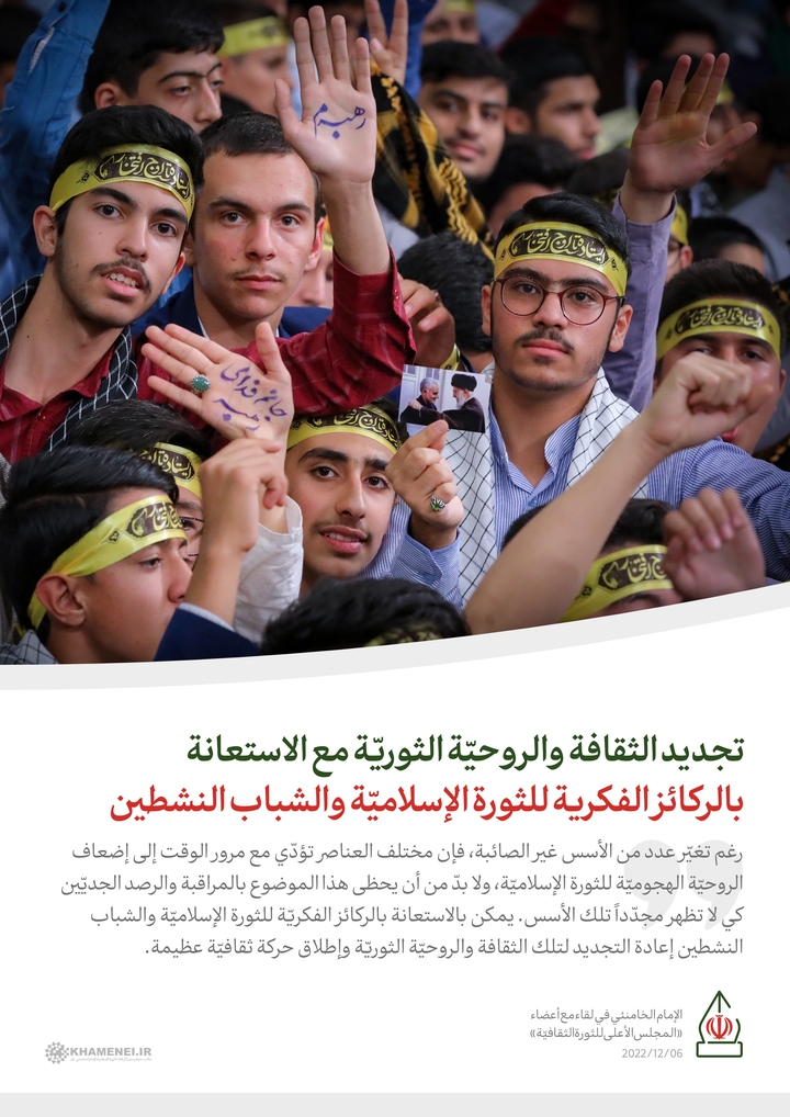 رغم تغيّر عدد من الأسس غير الصائبة، فإن مختلف العناصر تؤدّي مع مرور الوقت إلى إضعاف الروحيّة الهجوميّة للثورة الإسلاميّة، ولا بدّ من أن يحظى هذا الموضوع بالمراقبة والرصد الجديّين كي لا تظهر مجدّداً تلك الأسس. يمكن بالاستعانة بالركائز الفكريّة للثورة الإسلاميّة والشباب النشطين إعادة التجديد لتلك الثقافة والروحيّة الثوريّة وإطلاق حركة ثقافيّة عظيمة.